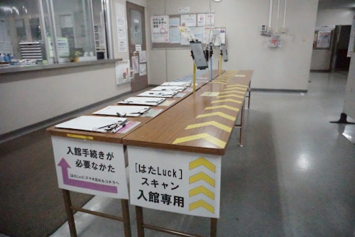 従業員通用口は「はたLuck」を使用して入館する場合と、紙での入館手続きが必要な方向けにわかりやすく導線が分けられています。矢印の色を分けるなどしてスムーズな入館ができるように工夫されています。なんとこの仕組み、防災センターの皆さまの手作りなんだとか!